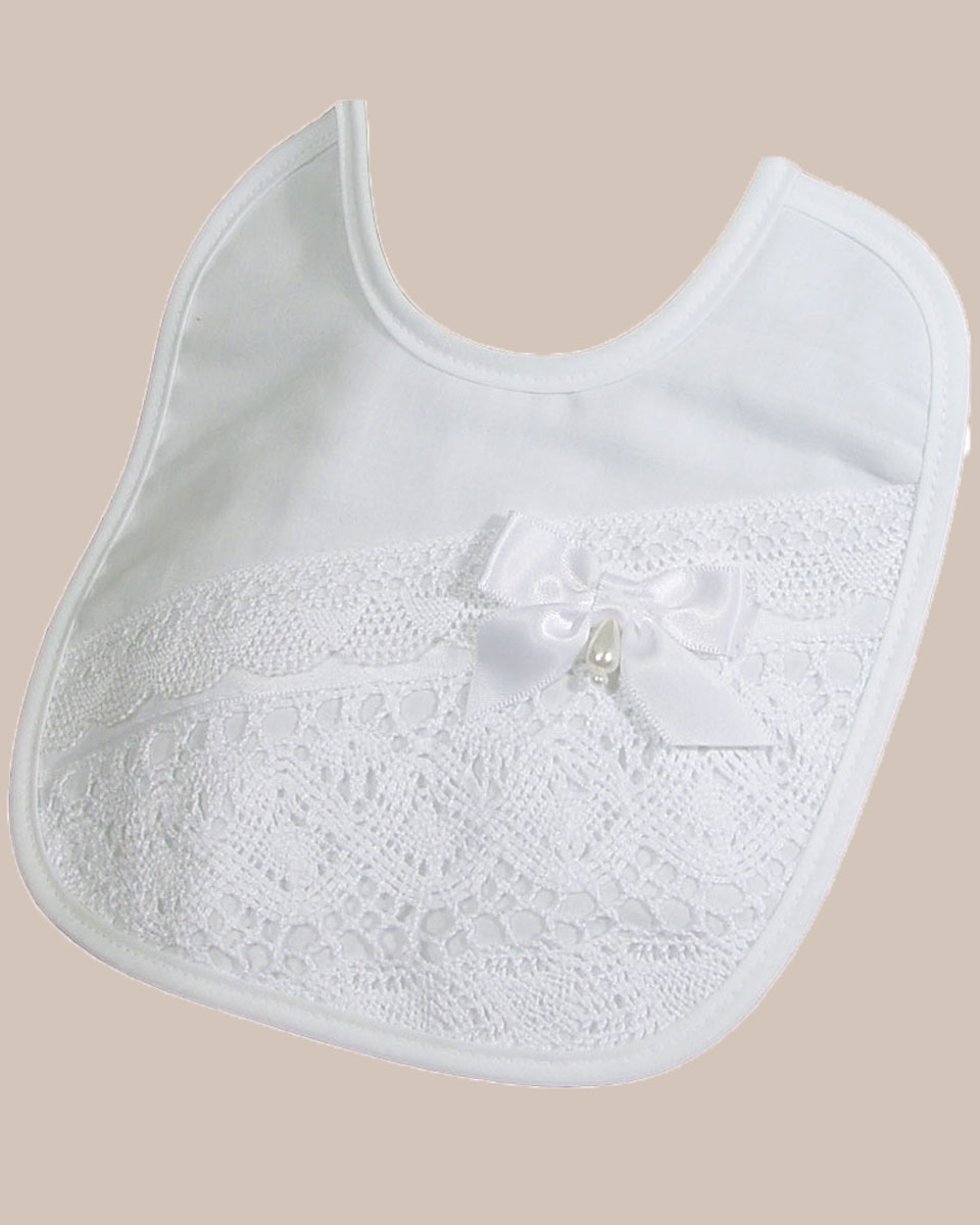 Cotton batiste bib, accented with cluny trim, ribbon bow. Approximate size: 6.5″ x 6.5″.