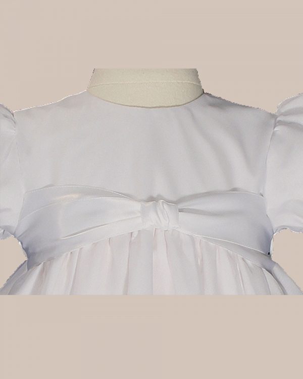 This beautiful all-white christening/baptismal gown is perfect for any special occasion such as a christening, baby blessing, wedding, church presentation, dedication, and keepsake photos. Sweet organza overlaid day-length Christening dress with satin hem and waistband. Includes matching bonnet. Made of poly cotton and poly organza. Hand wash. (OR34GS)