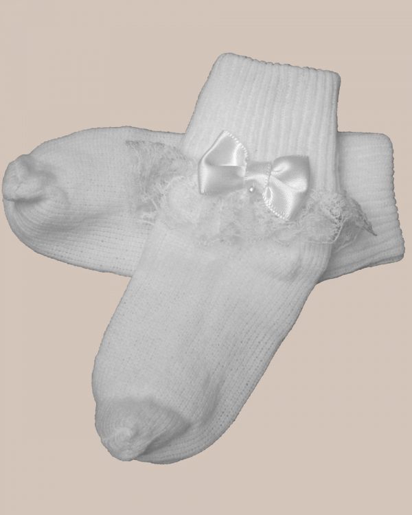 Baby girls white 100% cotton or nylon anklet sock trimmed with a bow and pearl.