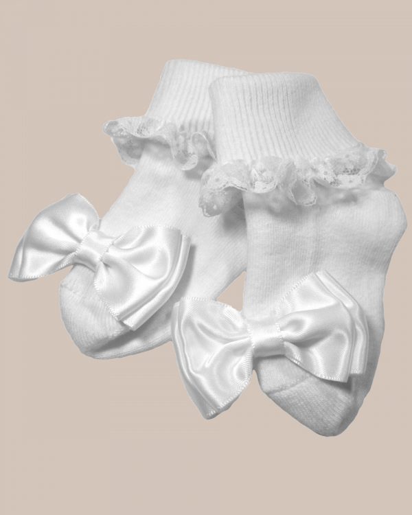 100% Cotton girls socks with lace adorned cuff and a large beautiful bow on the toe. High quality girls socks perfect for Christening, Baptism or any other special occasions.
