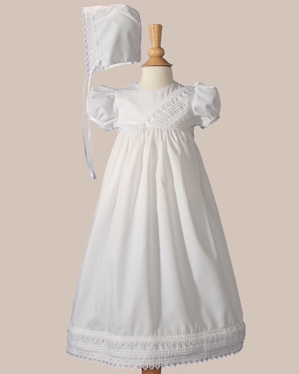 Girls heart trimmed cotton blend christening gown. Features beautiful pin tucking and stylish heart lace applique on the bodice.