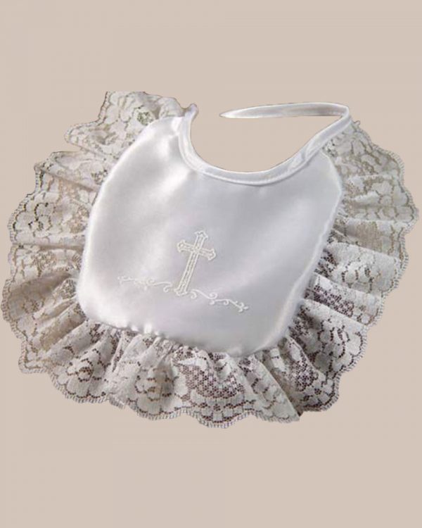 Girls Matte Satin Bib with Lace and Cross