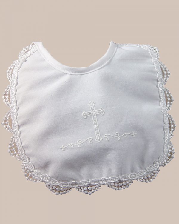 Polycotton bib with puff silk screened cross. Edged with rayon venise trim. Backed with polyester flannel. Hand Washable. Approximate size: 6.5″ x 6.5″. (EGXB2)