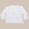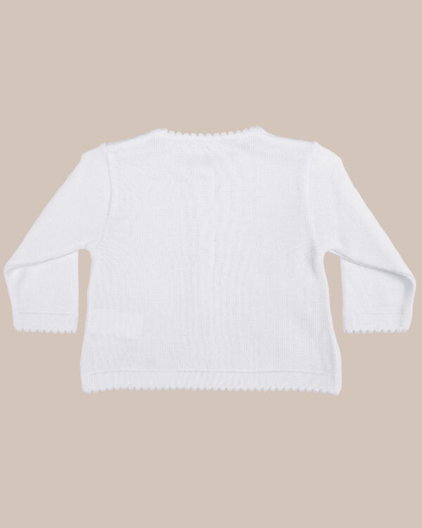 This girl’s white 100% combed cotton sweater is an ideal addition to any dress or gown. Features a diamond knit bodice that provides style and breathability, making it wearable any time of the year. A small white cotton bow accents the front and elegant rosebud trim adorns sleeves, neckline, and hem. Three-button front closure for a great fit and easy changing. Made from super soft combed cotton, a softer version of cotton that is higher quality and more durable. Heirloom Preservation Bag recommended for long-term storage. (Click Here) Perfect for Christening, Baptism, church, weddings, dedications, keepsake photos, or any other special occasions! (CKGRLS2)