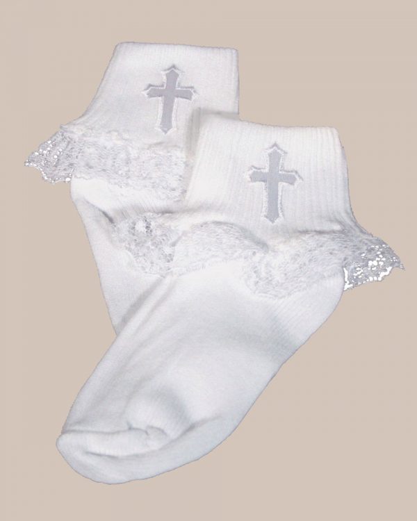 Girls White Anklet Socks with Embroidered Cross Applique and Lace.