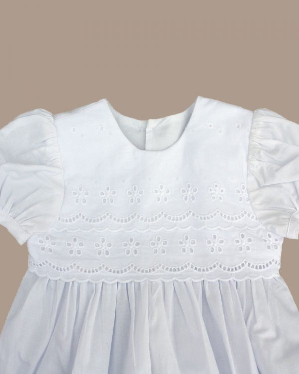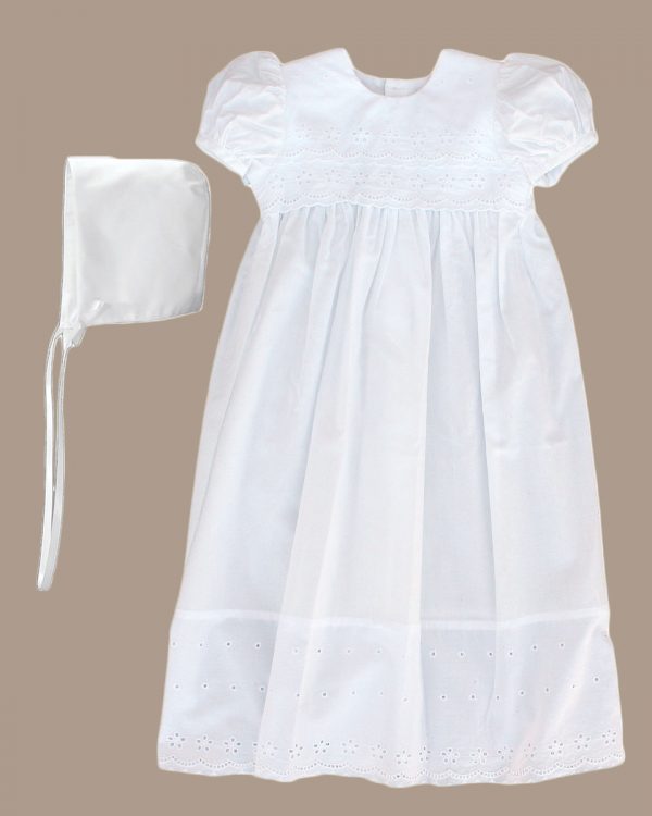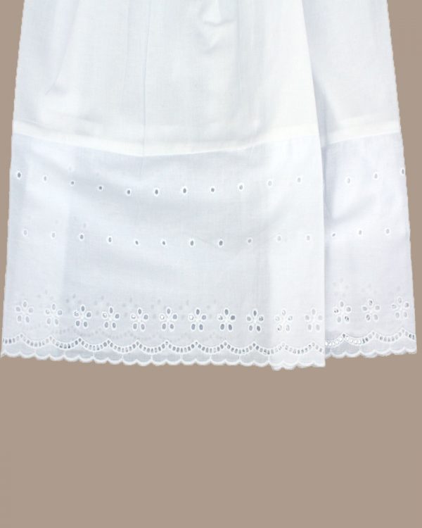 Beautiful girls 100% cotton Christening special occasion gown. Features floral border eyelet across the bodice and hem that offers a traditional and elegant look.