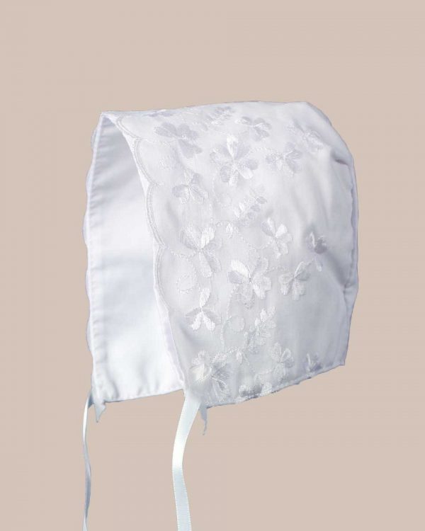 An elegant baby girls bonnet/hat featuring embroidered shamrocks, scalloped edging, ribbon ties, full lining, and is made from a super soft blend of 65% Polyester 35% Cotton.