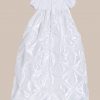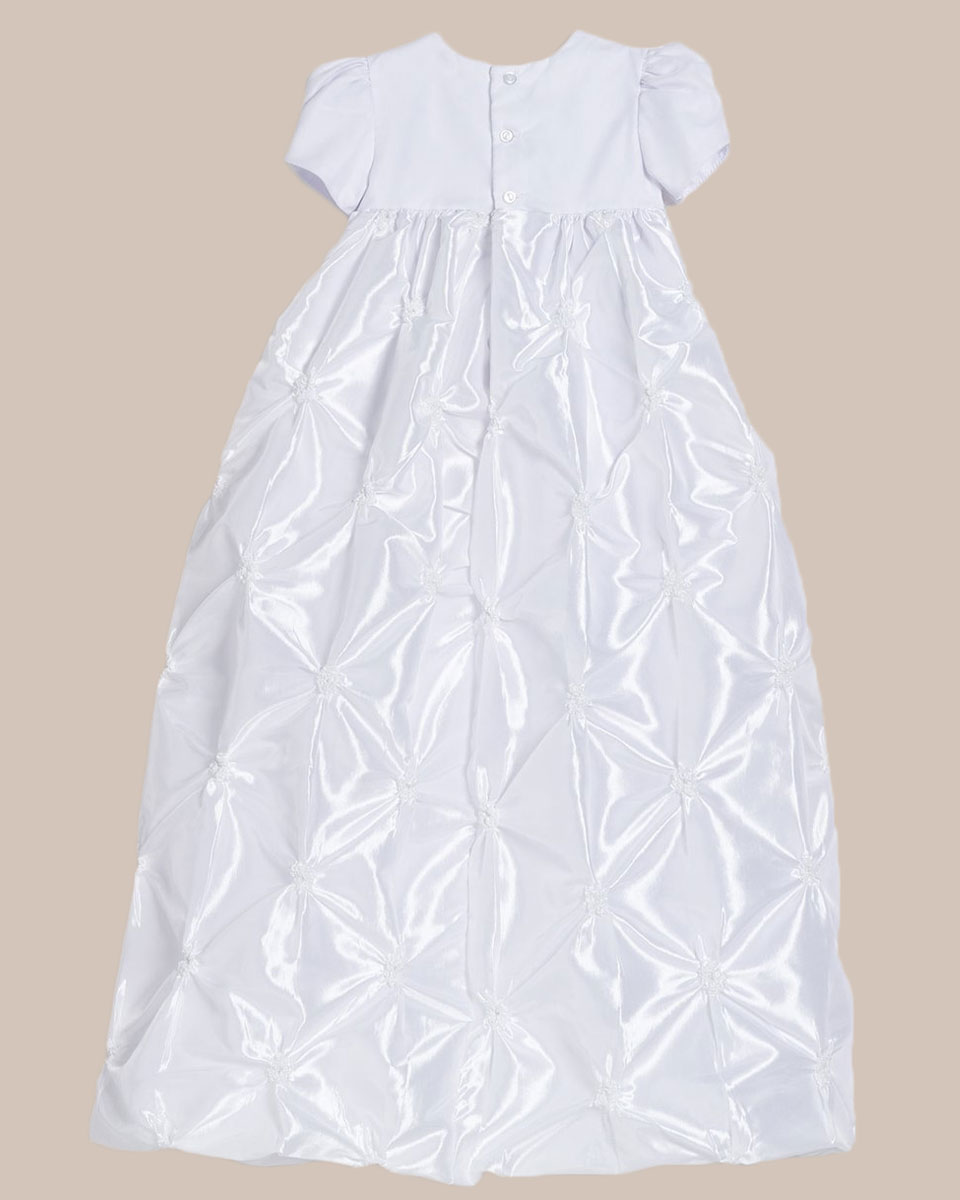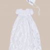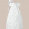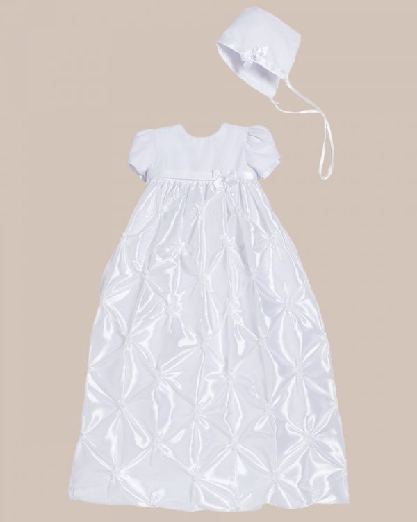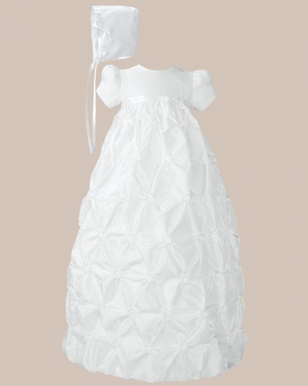 Charming 31″ white gown with gathered rosette skirt and organza layered bodice. Includes matching bonnet. The 18 & 24 month sizes are 25″ and 27.5″ in length respectively to allow for walking.