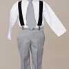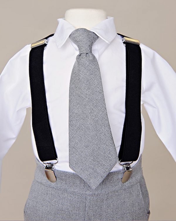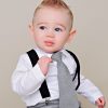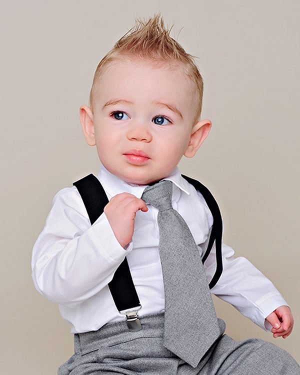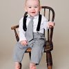 This classic 50’s style outfit with gray, cashmere-soft pants and black baby suspenders is too delightful for words! The handsome button-up shirt is a bodysuit-style to keep your little man tucked-in all day!