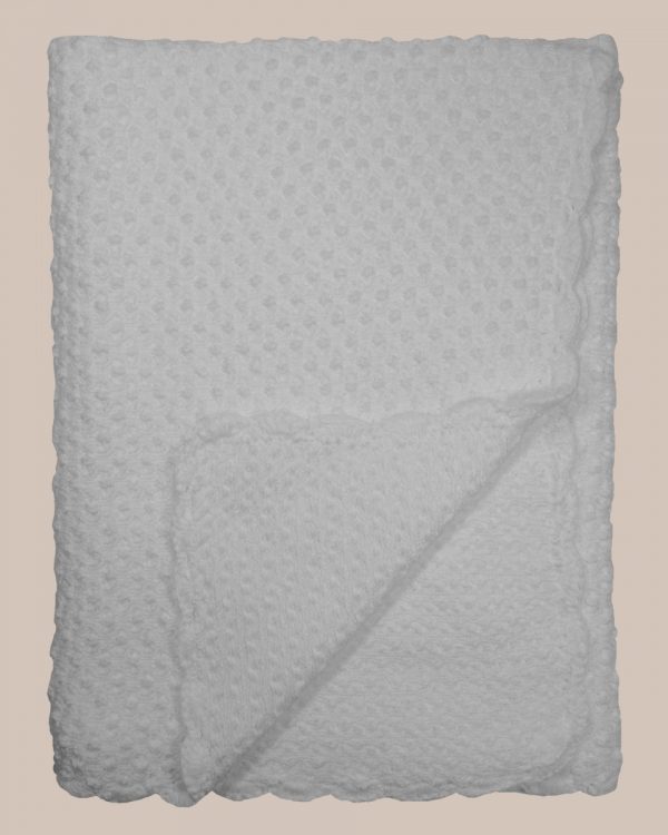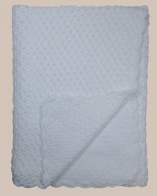 High quality 100% soft and breathable cotton knit white shawl/blanket with hand crochet bubble pattern and scalloped edging.