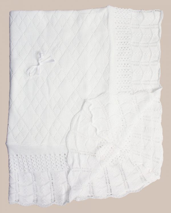 High quality 100% soft and breathable acrylic knit white shawl/blanket with thick hand crochet diamond pattern, crochet edging, and ribbon bow accent.