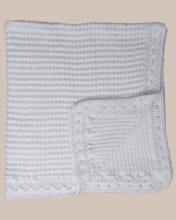 High quality 100% soft cotton knit white blanket/shawl with hand crochet wavy ripple design and crochet edging throughout. Approximate size: 39″ x 22″.
