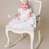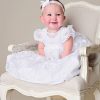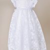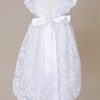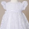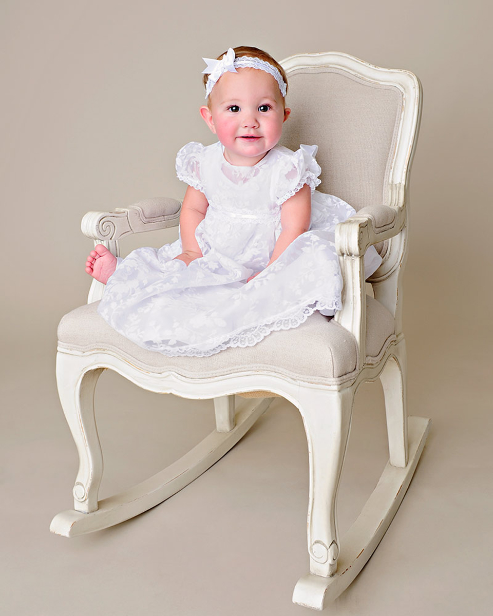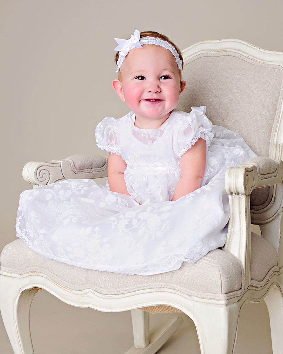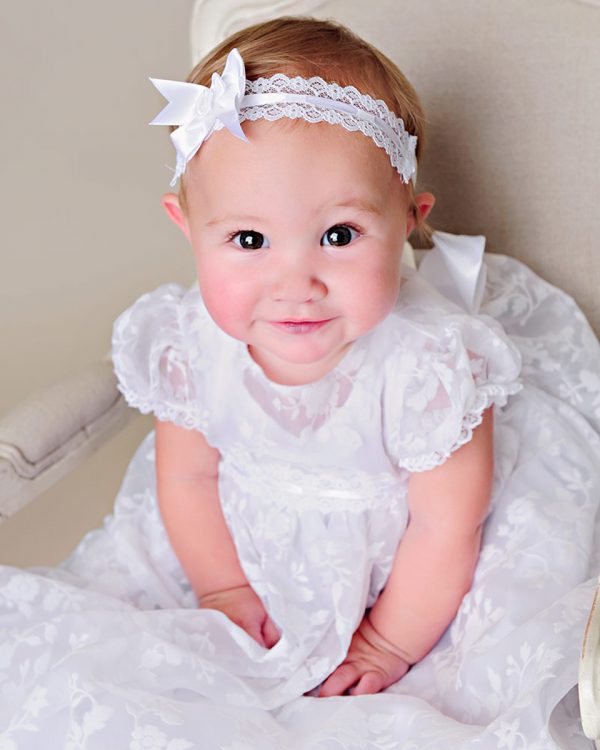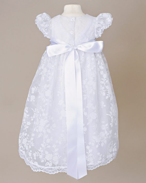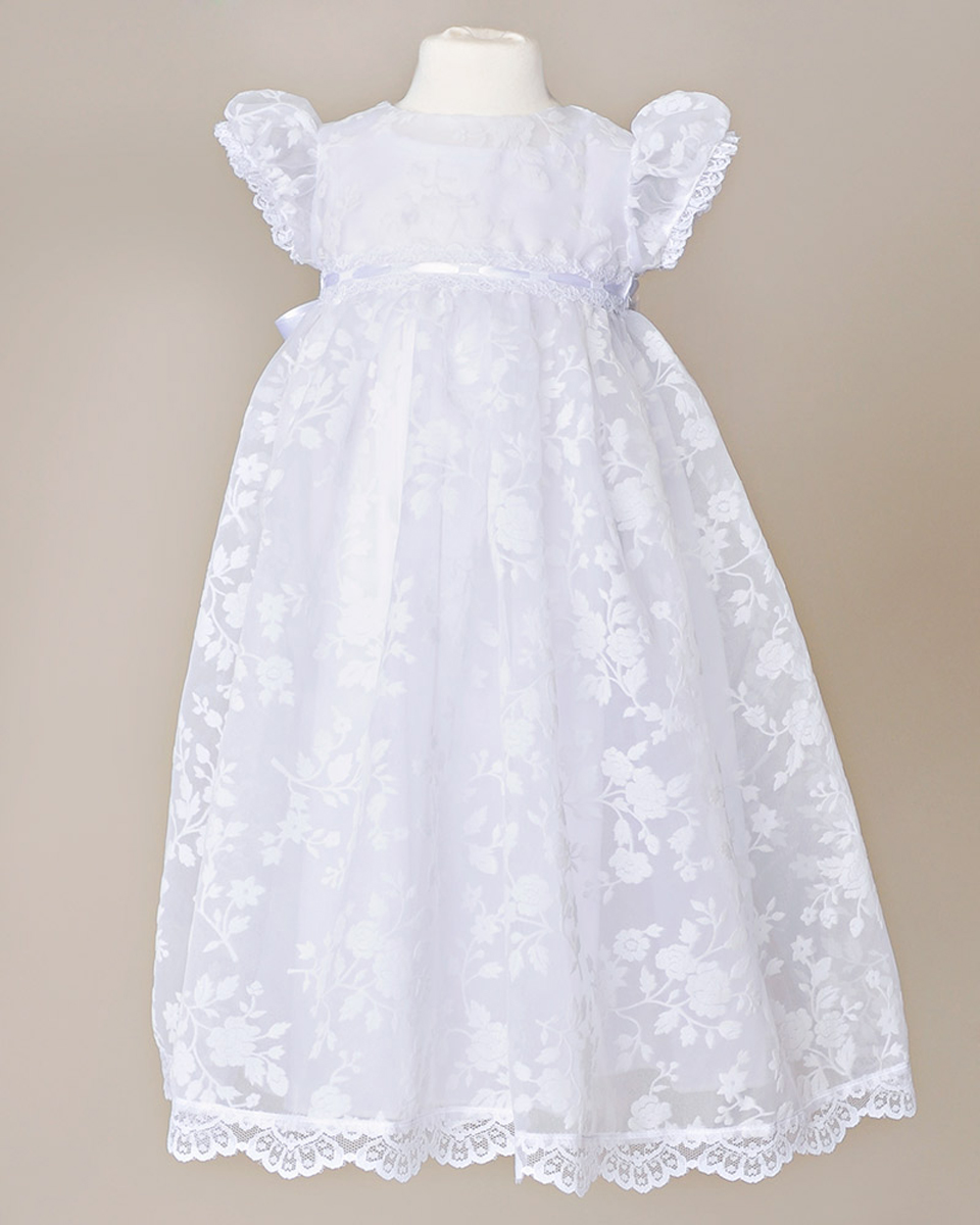 Floral organza with lace and satin ribbon details make this dress “oh so sweet”! Have her name peek through the sheer organza for a personal touch.