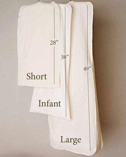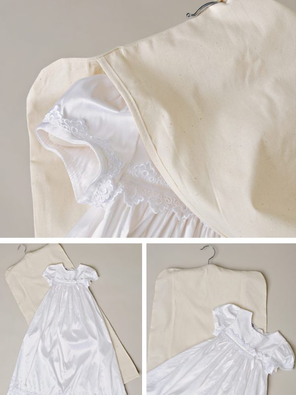 Simply constructed of natural unbleached muslin, this bag is a fabulous option for long-term storage of christening gowns.