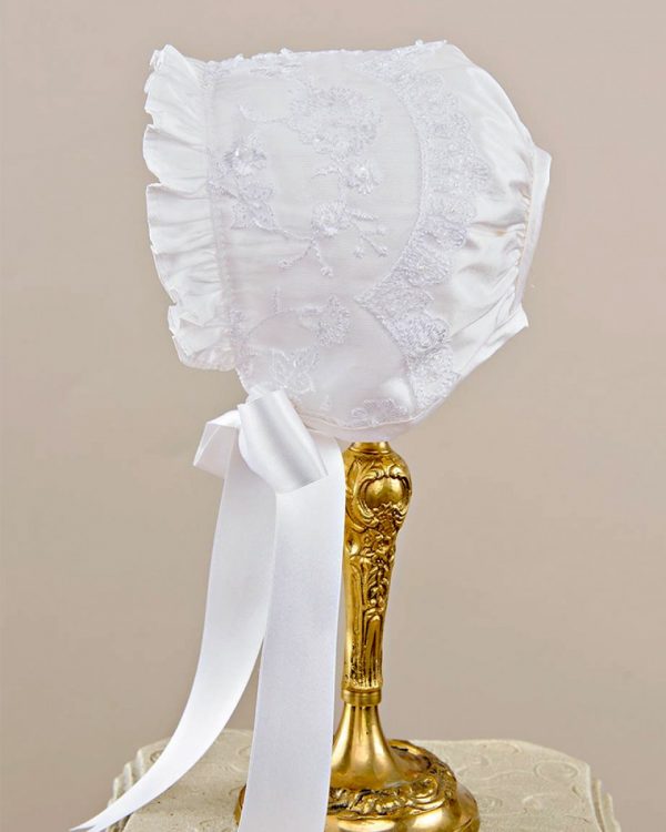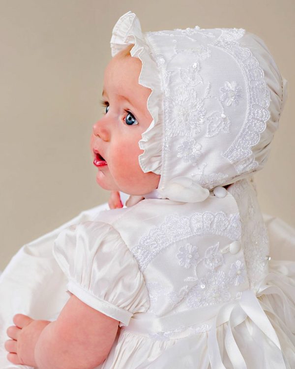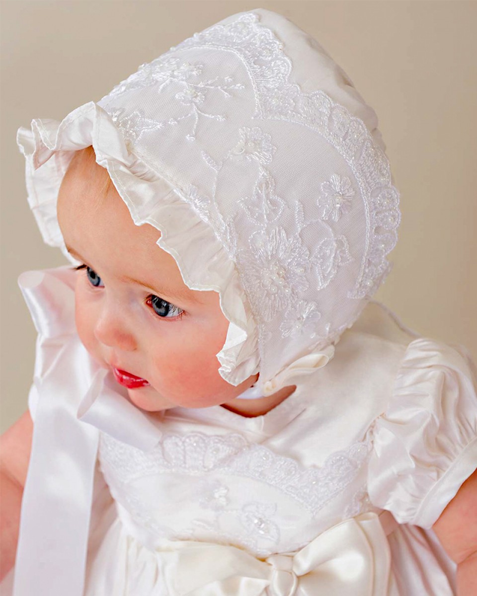 • Bodice & bonnet feature our lovely scalloped, beaded lace