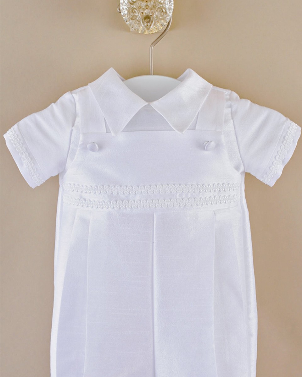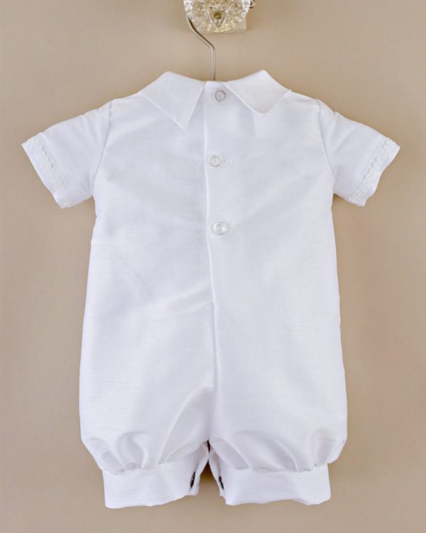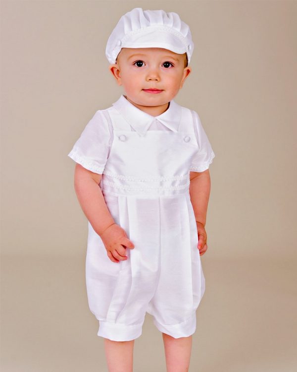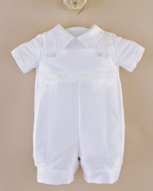 A handsome overall-styled romper for your little man in a mid-weight shantung fabric is perfect for warm weather events!