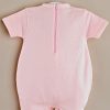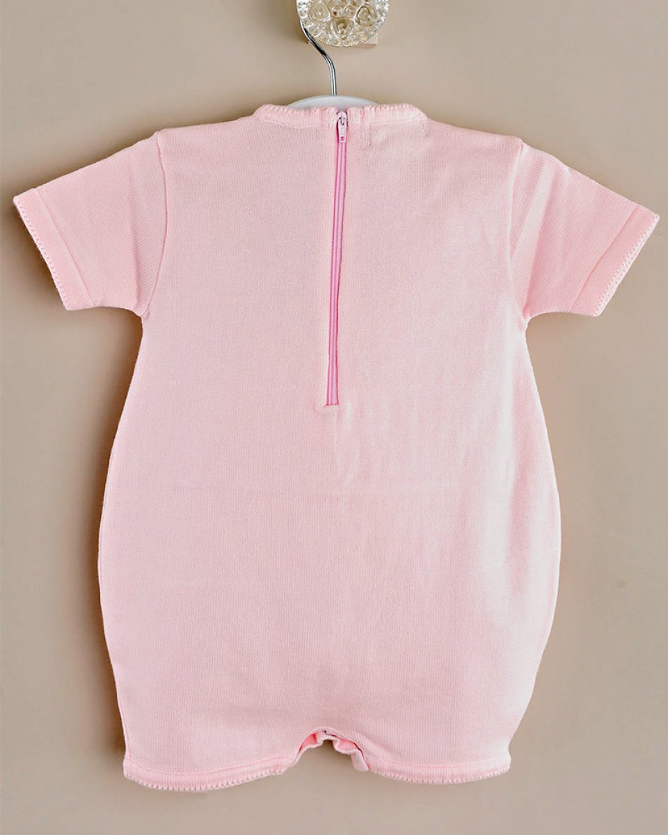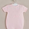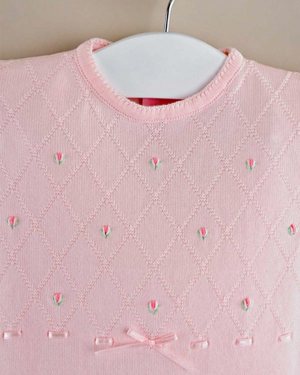 This delicate diamond-patterned knit romper is finished with hand-embroidered rosettes and pretty satin ribbon at the waist. Ideal for special portaits, parties, or as an “after the christening” outfit.