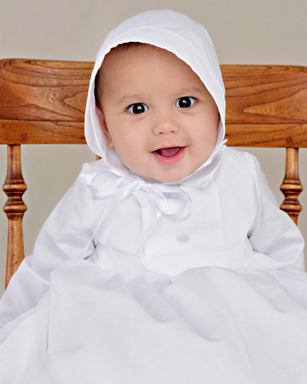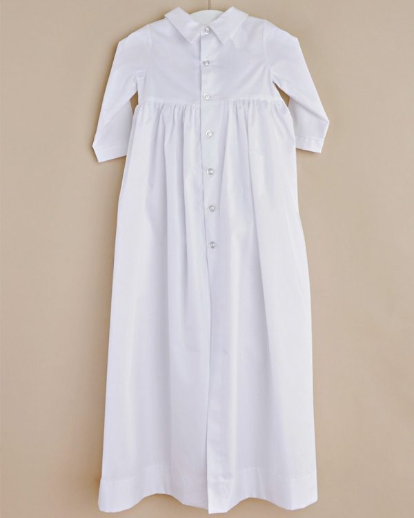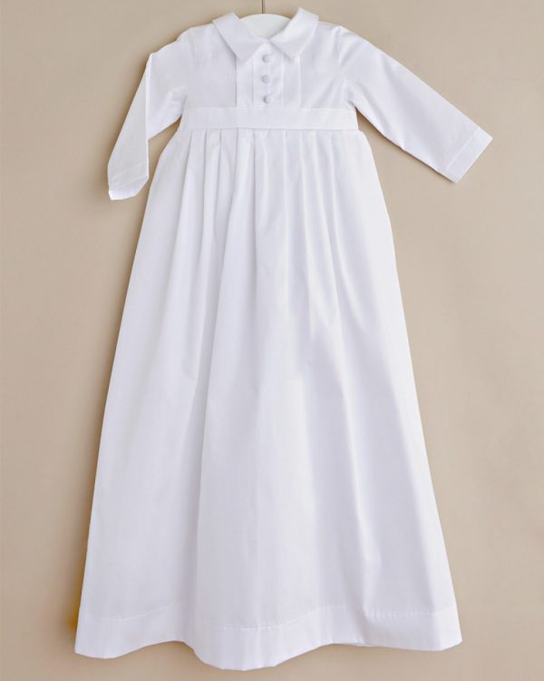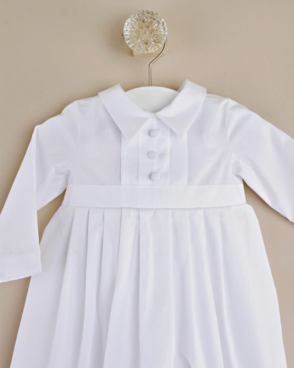 A classic collar and pleated shirt front lend princely elegance to our comfortable 100% cotton boys christening gown.