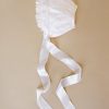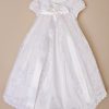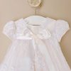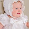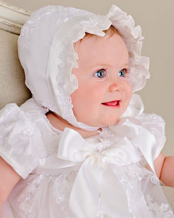 • The 3-piece set includes a gown, cotton slip, and bonnet