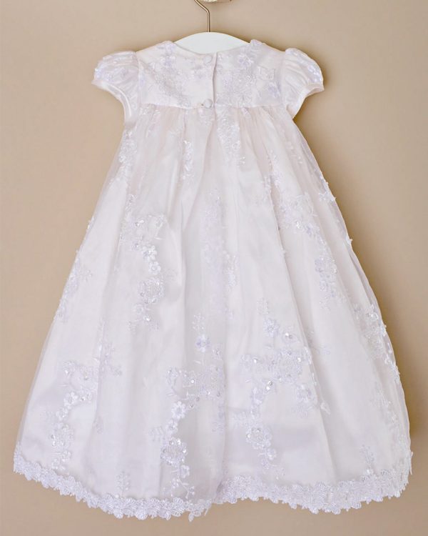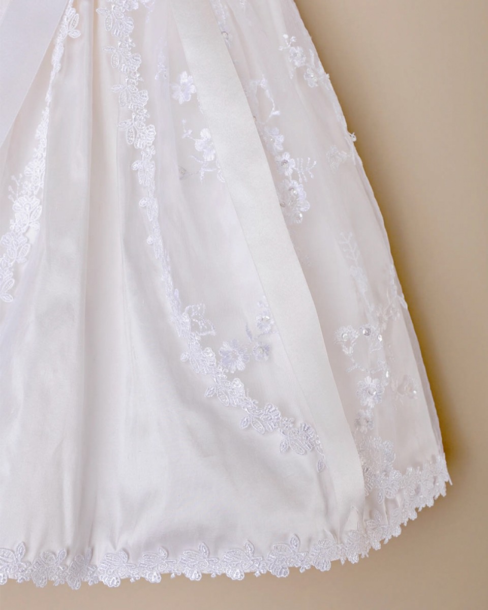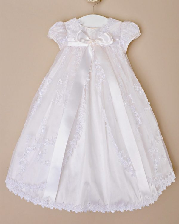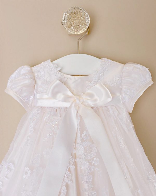 A beautiful day-length silk gown featuring a stunning cut-away beaded lace overlay and luxurious wide ribbon bow.