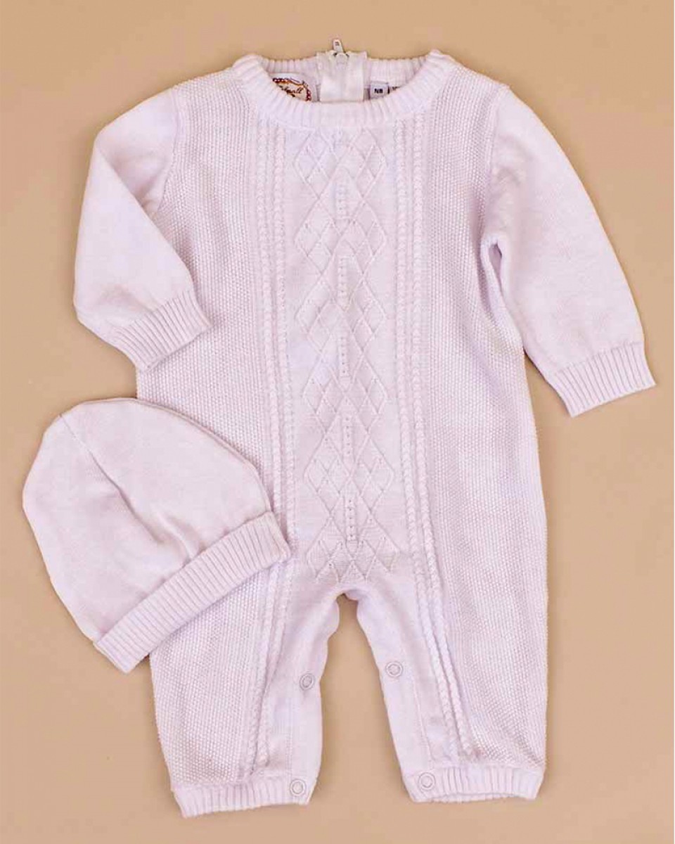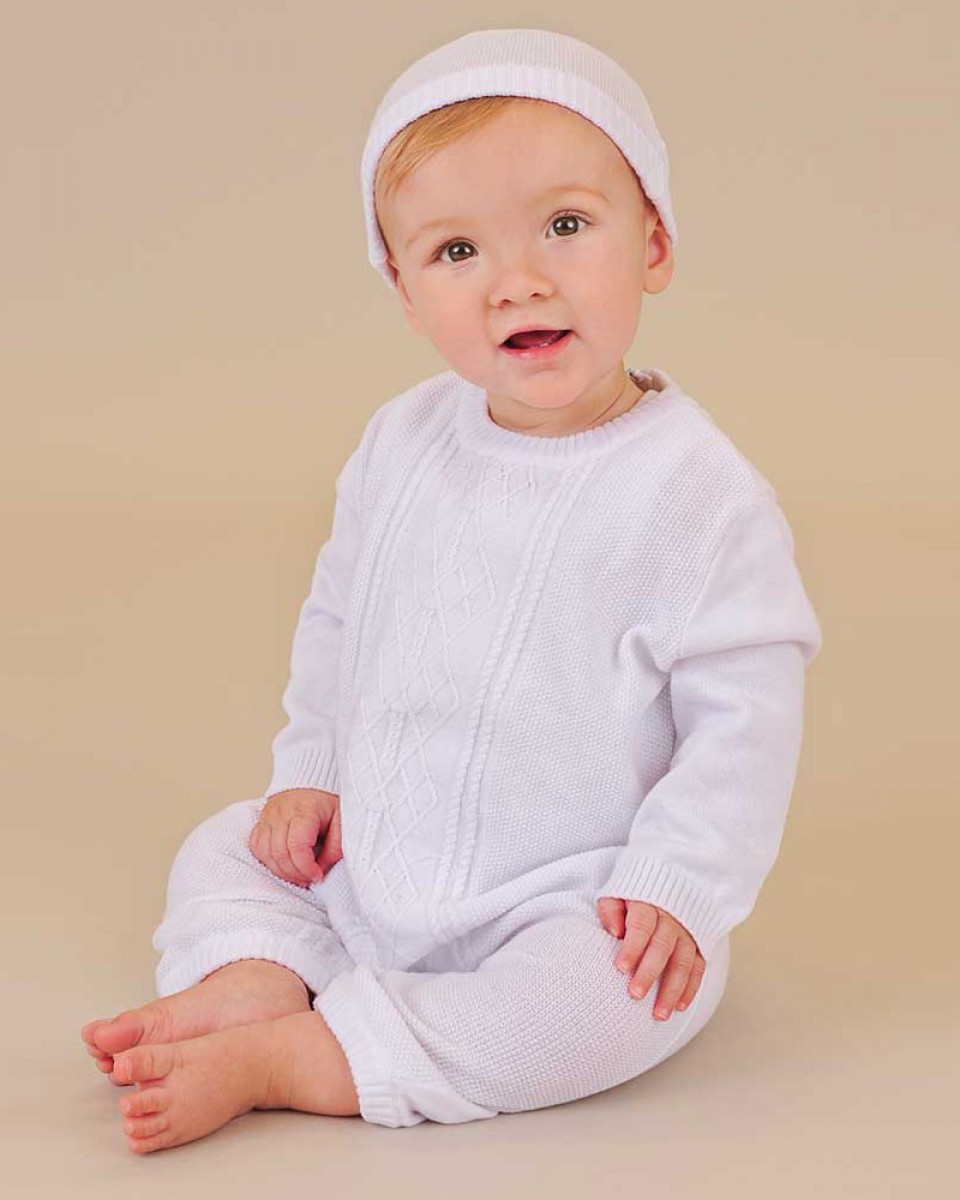 He’ll be handsome, warm and comfy in this simple but striking knit christening outfit!