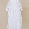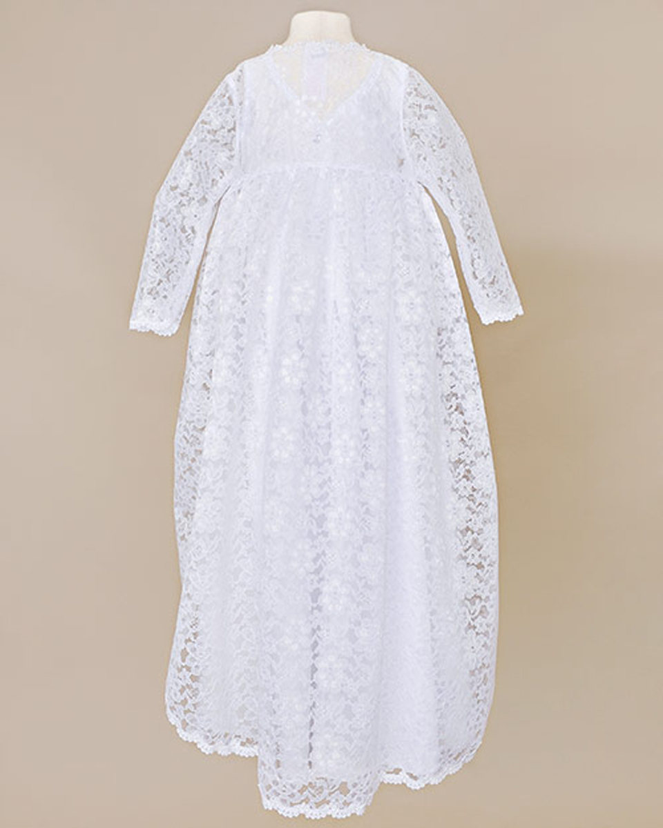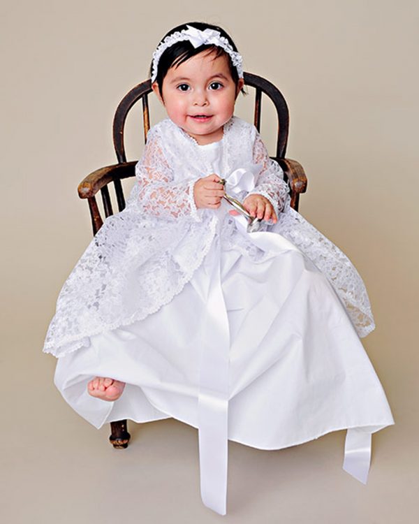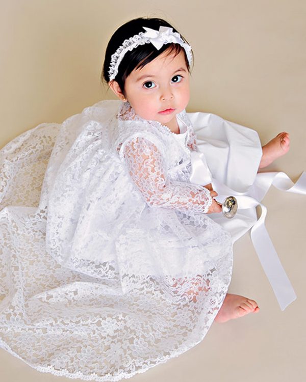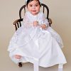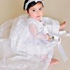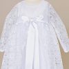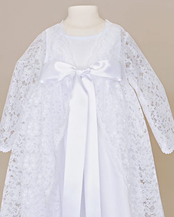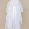 This dainty lace christening jacket will add elegance to any special gown for your little princess. The wide luxurious satin ribbon closes the jacket and the scallop lace trimming adds a dainty touch.