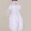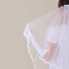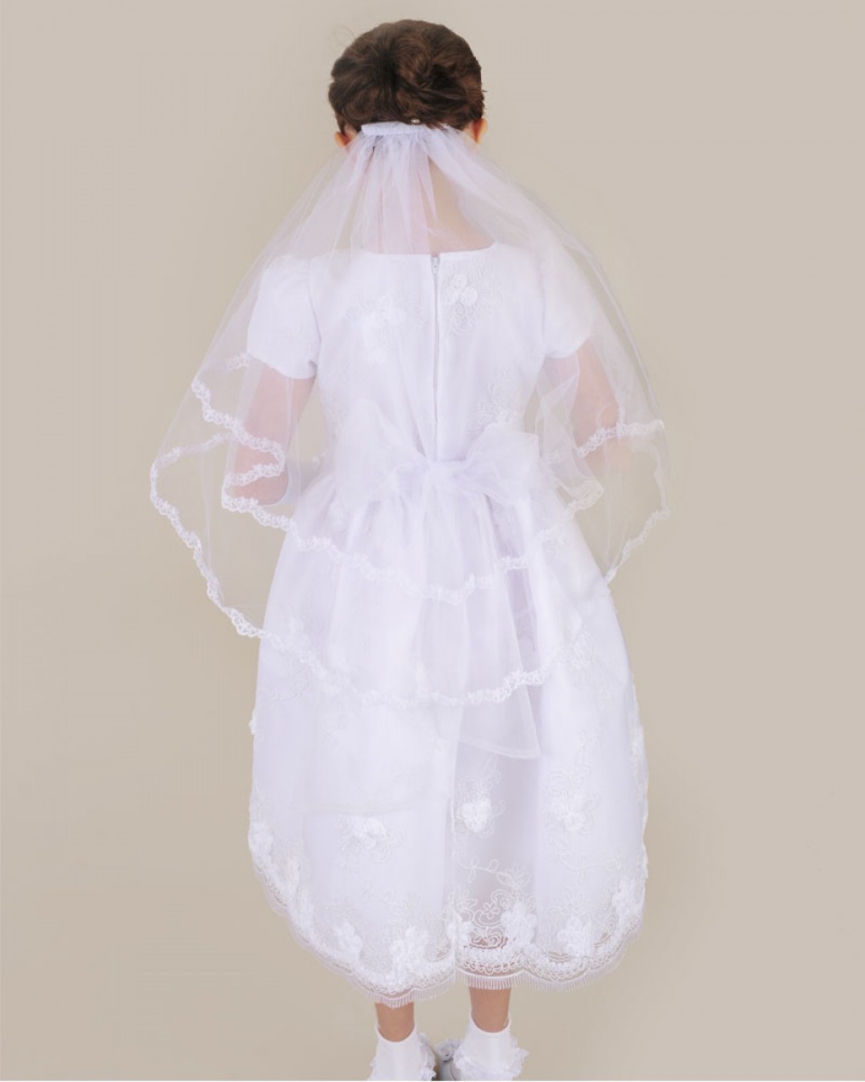 We love the simple beauty of this traditional, lace-trimmed comb veil. It will look lovely on its own or with any Communion headpiece.