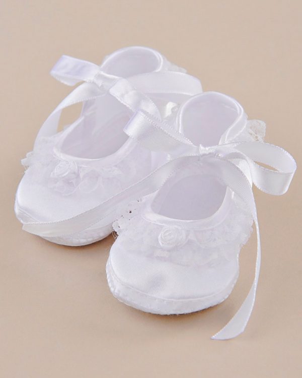 Dainty satin slippers trimmed with frilly lace ruffles, pretty little flowers, and tied up with ribbons.