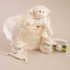 Our personalized muslin tote is filled with a lovely selection of soft lambs for your little one to snuggle. An impressive gift for any baby!