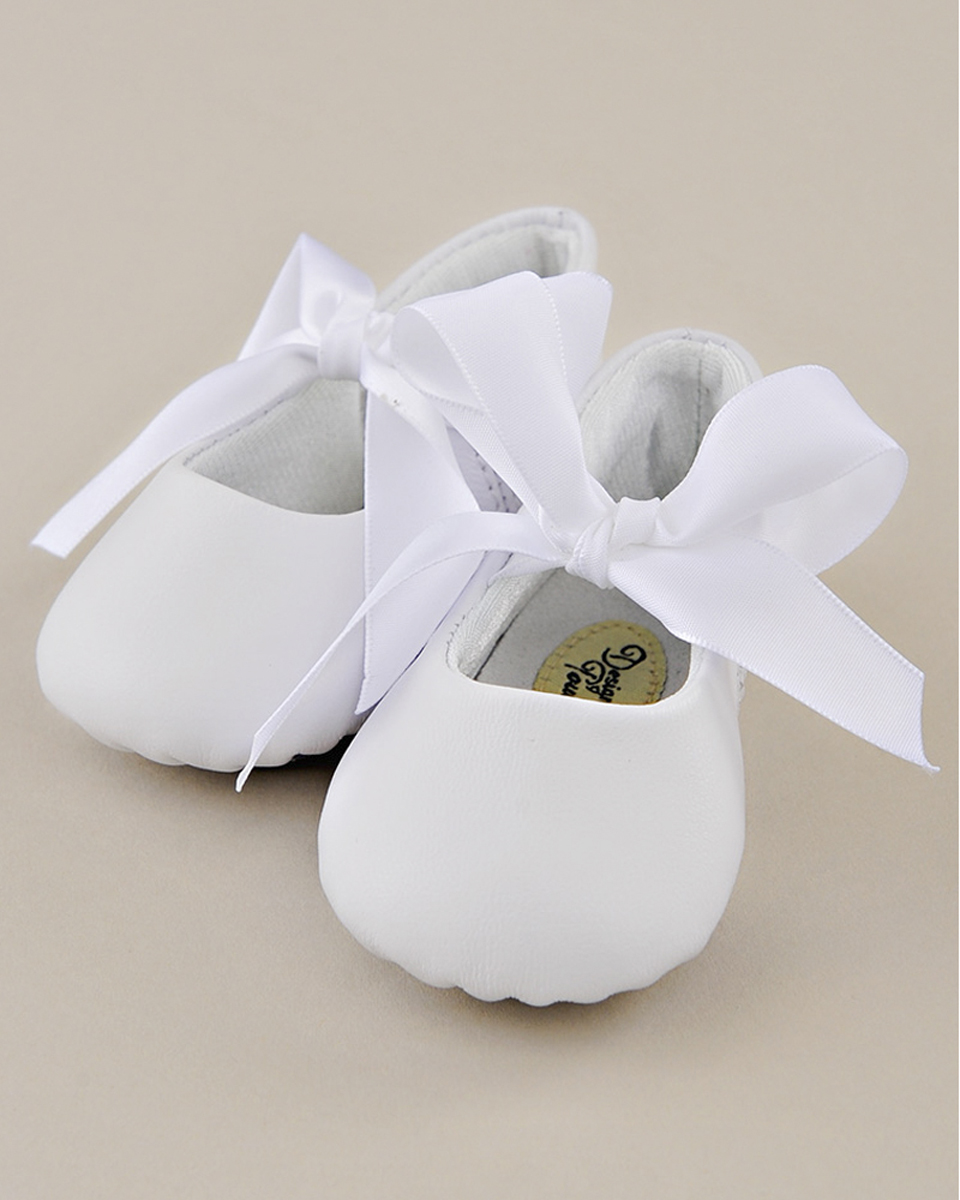 Soft leather slippers with satin ribbon ties will surely inspire the future ballerina in your little star-of-the-show!