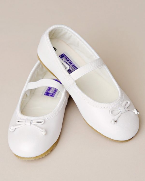 Versatile enough to complement any style, these dainty white leather ballet slippers are available in toddler sizes 5-9.