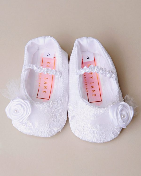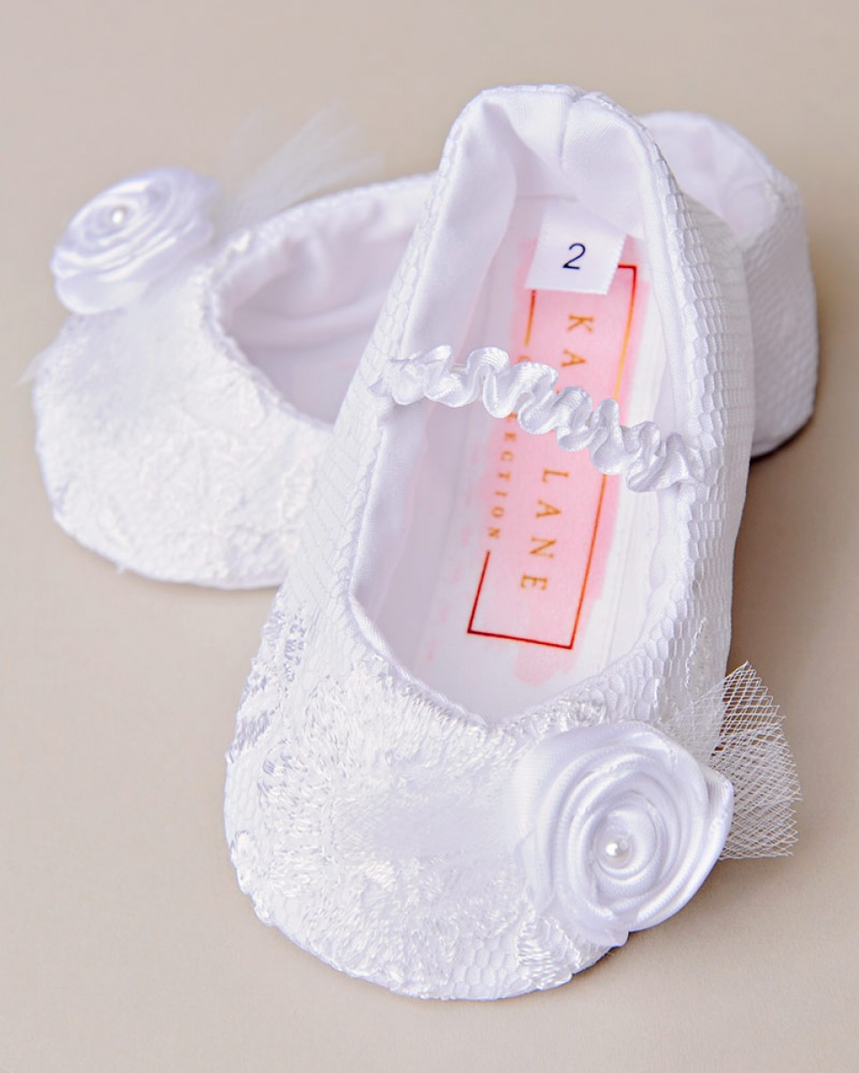 Tiny slippers handcrafted of delicate lace, are perfect match for our lovely Lillian Christening Gown, and they also look fabulous with any cute outfit!