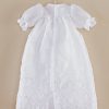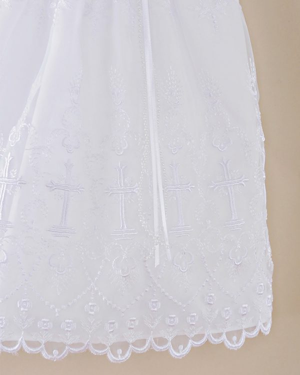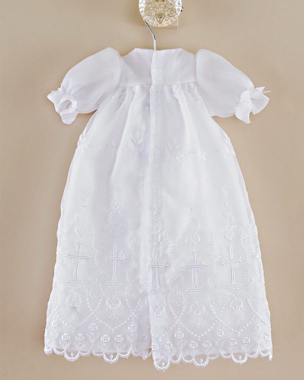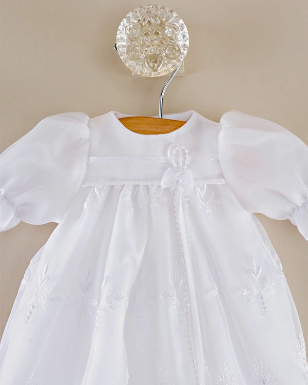 Fabrics: embroidered polyester organza (a plain weave fabric made of tightly twisted yarns in a sheer, light weight with a crisp finish) with a silky-soft polyester lining