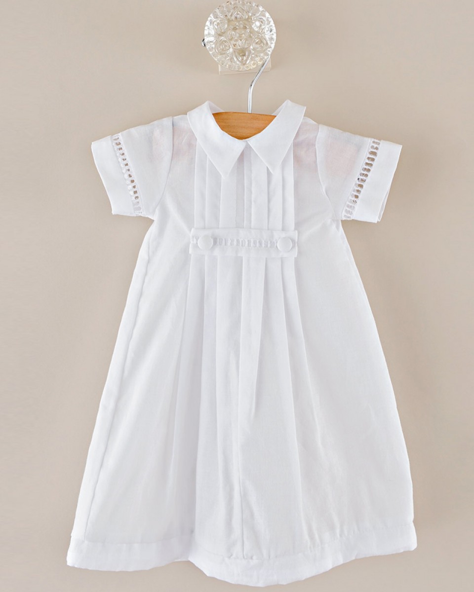 Traditional gown styling for your little baby boy: pleated summer-weight cotton lawn with crisp shirt collar, rows of pleats, and old-fashioned entre-deux trim.