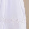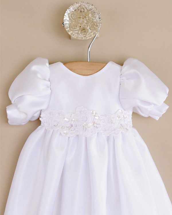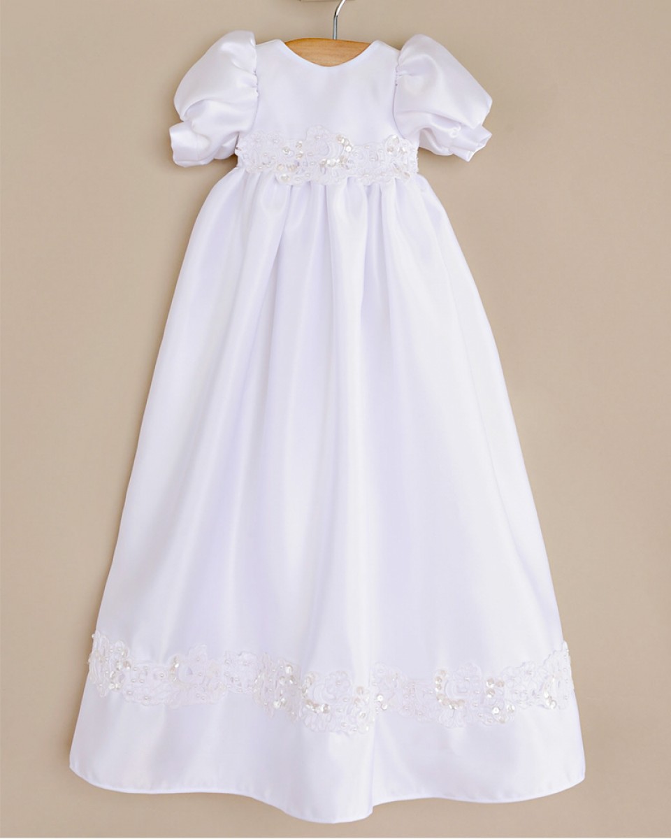 Fabric: 100% polyester matte satin (a mid-to-heavy weight pure white polyester product with a “de-lustered” surface, which has a soft, rich glow rather than a glaring shine)