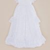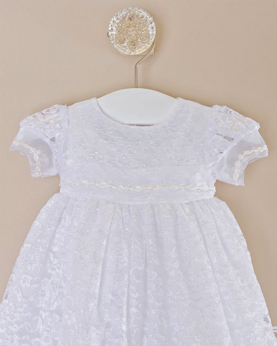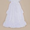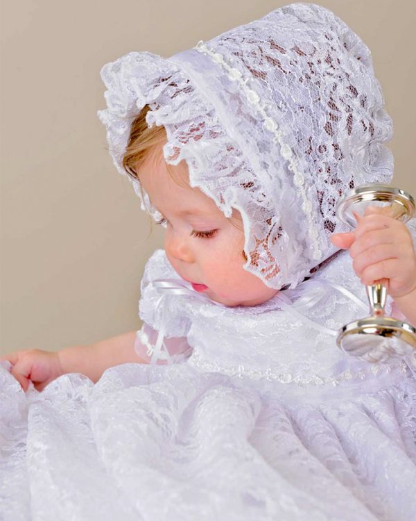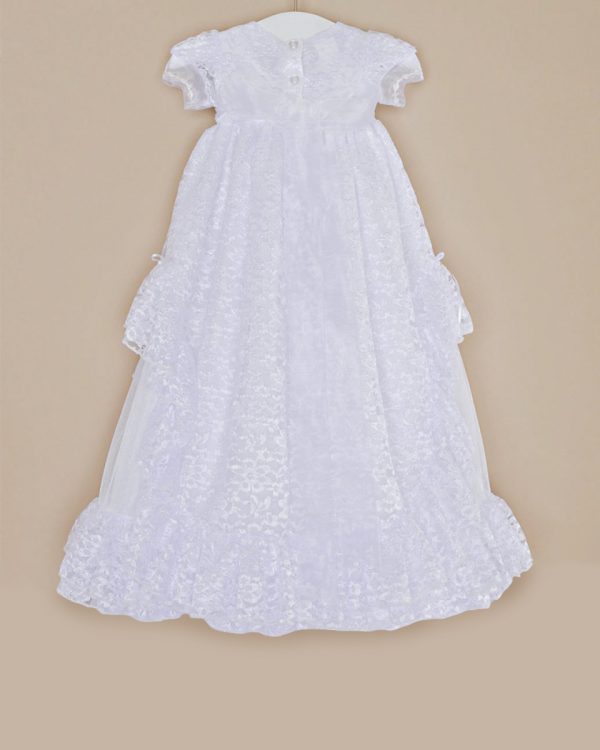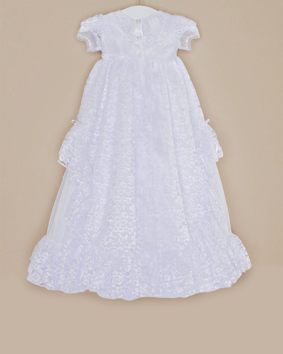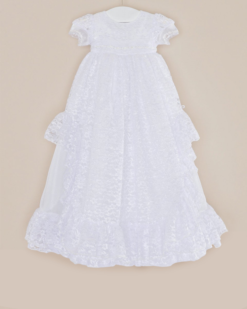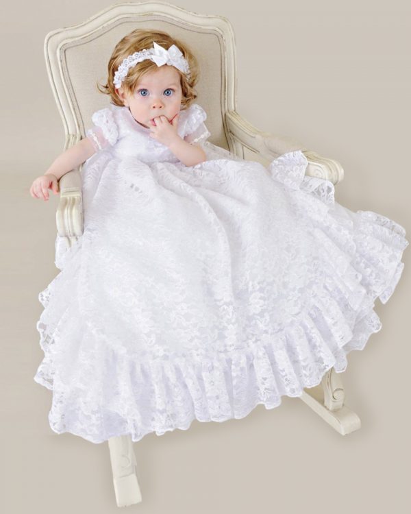 A frilly lace gown trimmed with yards and yards of ruffles and ribbons: a girl’s dream come true!