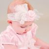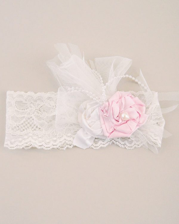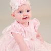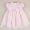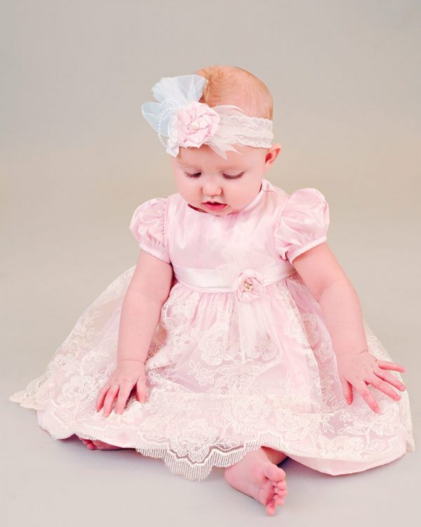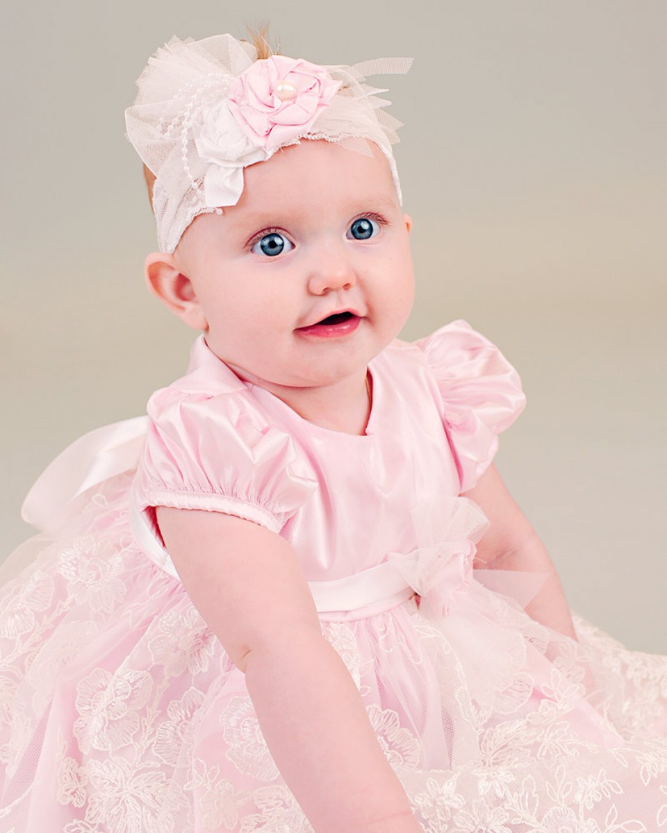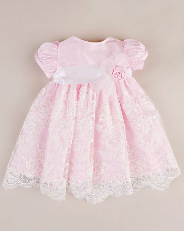 Richly embroidered lace lays atop the pink silk skirt of this dress. An elegant choice for her first birthday or any special occasion!