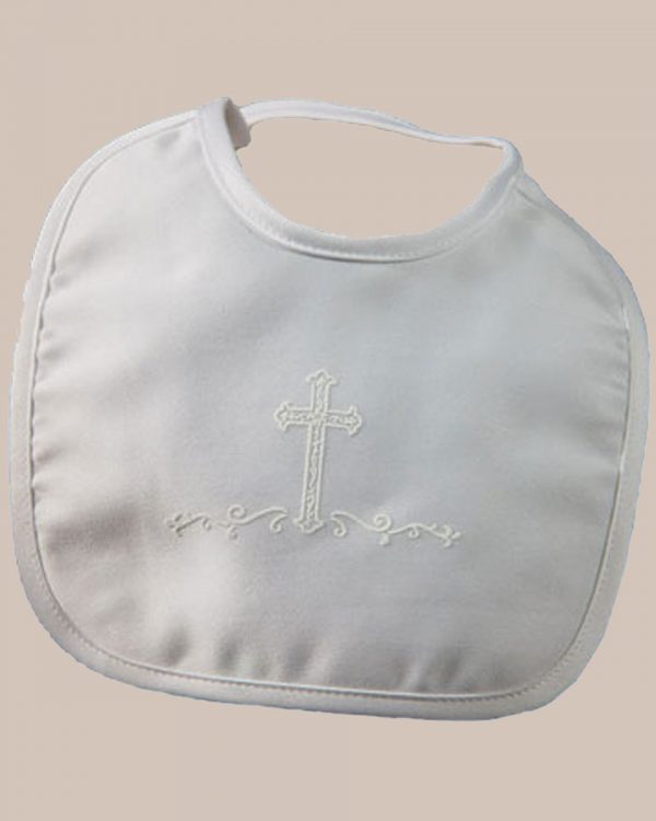 Matte satin christening bib with puff silk screened cross. 100% Polyester. Backing is polyester flannel. Hand wash.