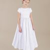 A special dress for a special day, this beaded satin ball-gown features dainty floral embroidery and a gorgeous cutaway-back skirt.