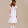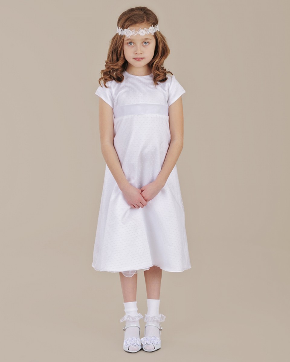 Fresh Swiss-dot organza is cut in a girlish A-line style and finished simply with a tailored organza waistband.
