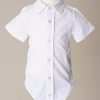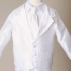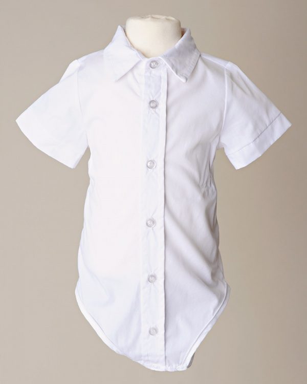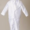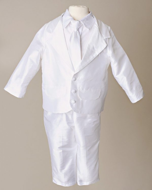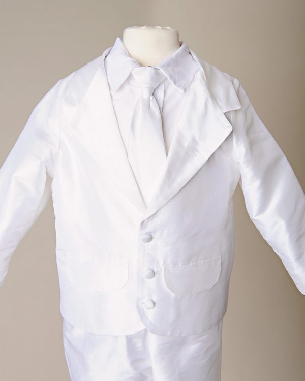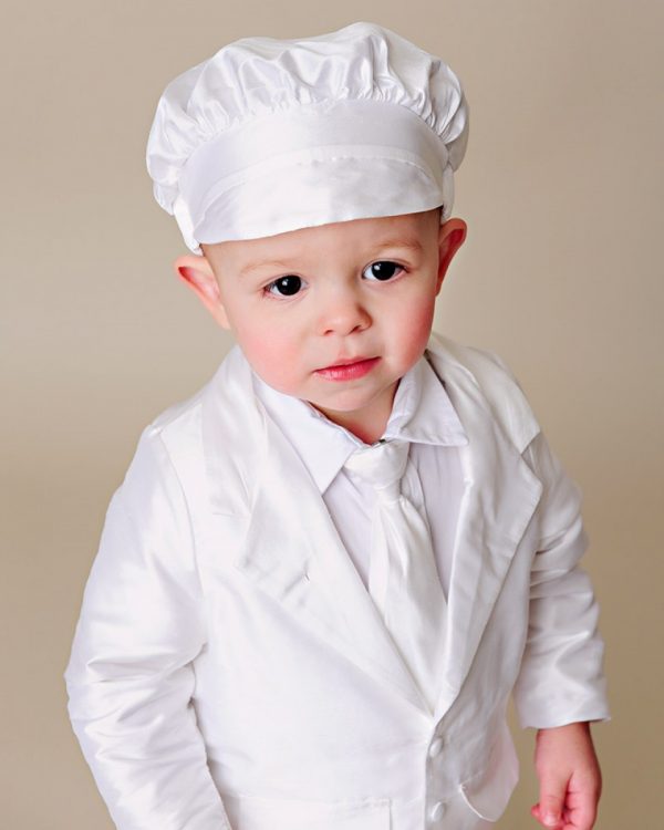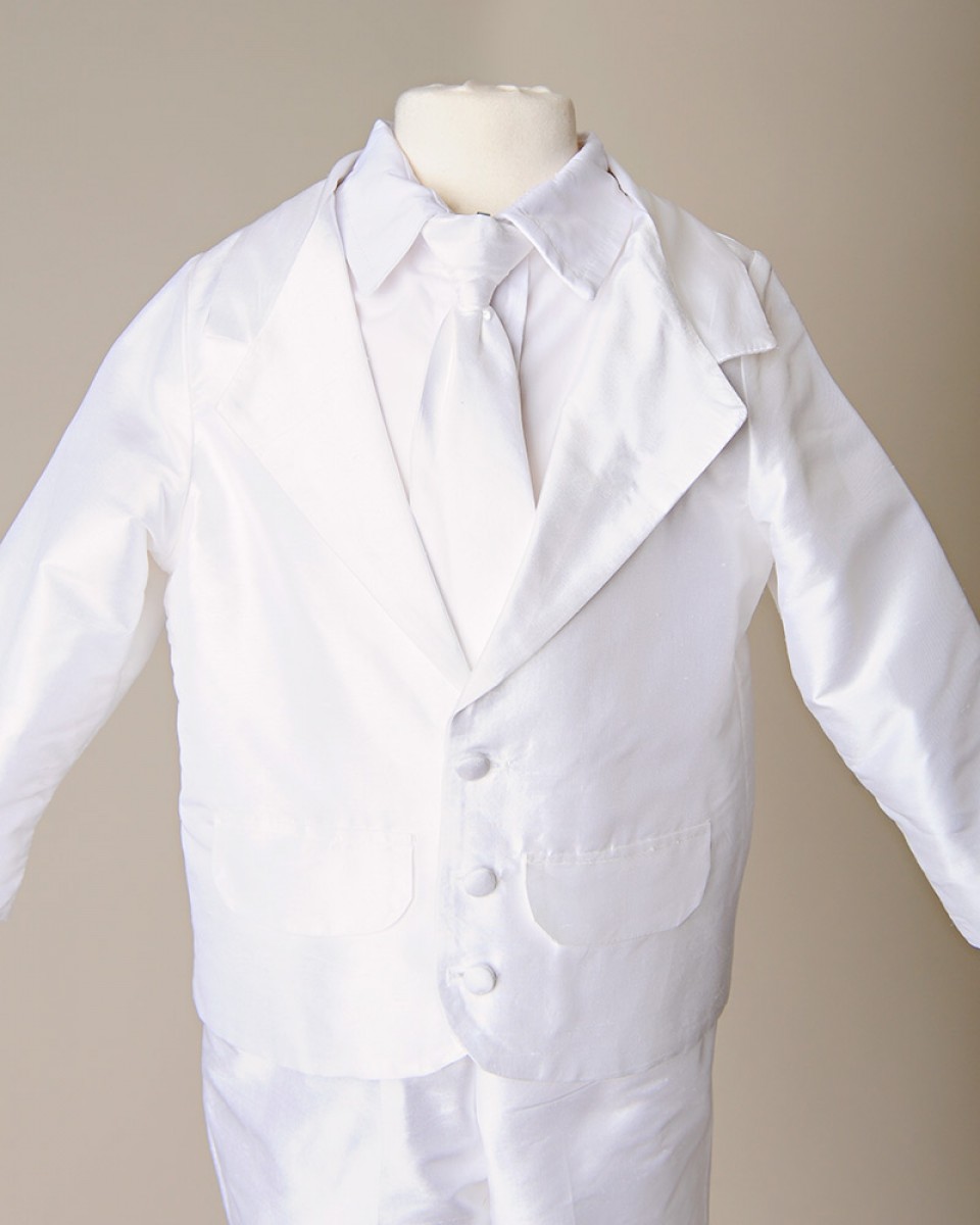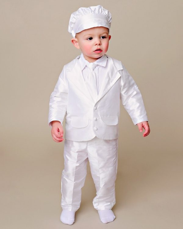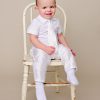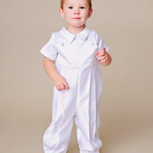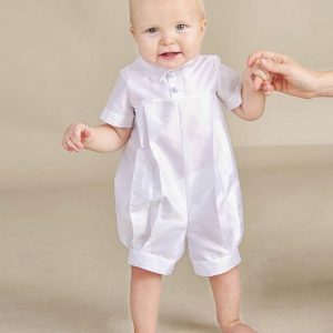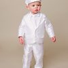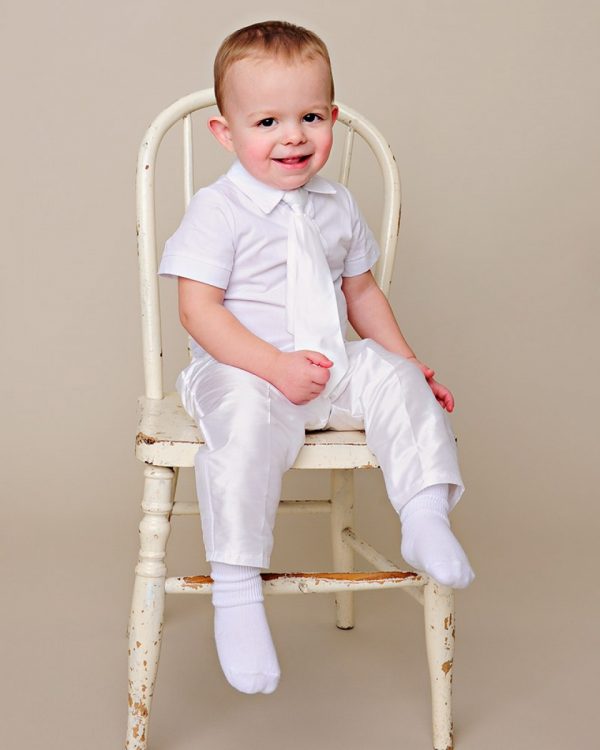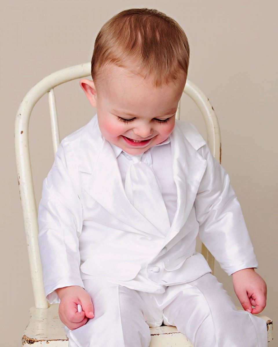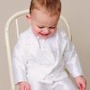 A sophisticated silk pant suit will be perfect for your little gentleman’s special occasion! We love the tailored details on our Mitchell christening outfit.
