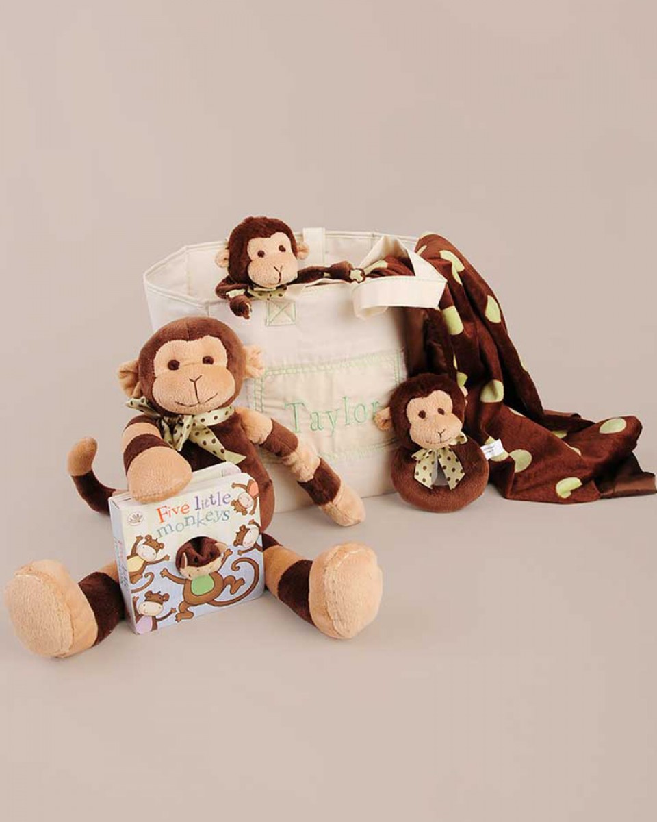 Give this show-stopping basket of monkeys: our personalized muslin tote is filled with an adorable assortment of monkeys for your little one to cuddle and play with. A wonderful gift for any baby!