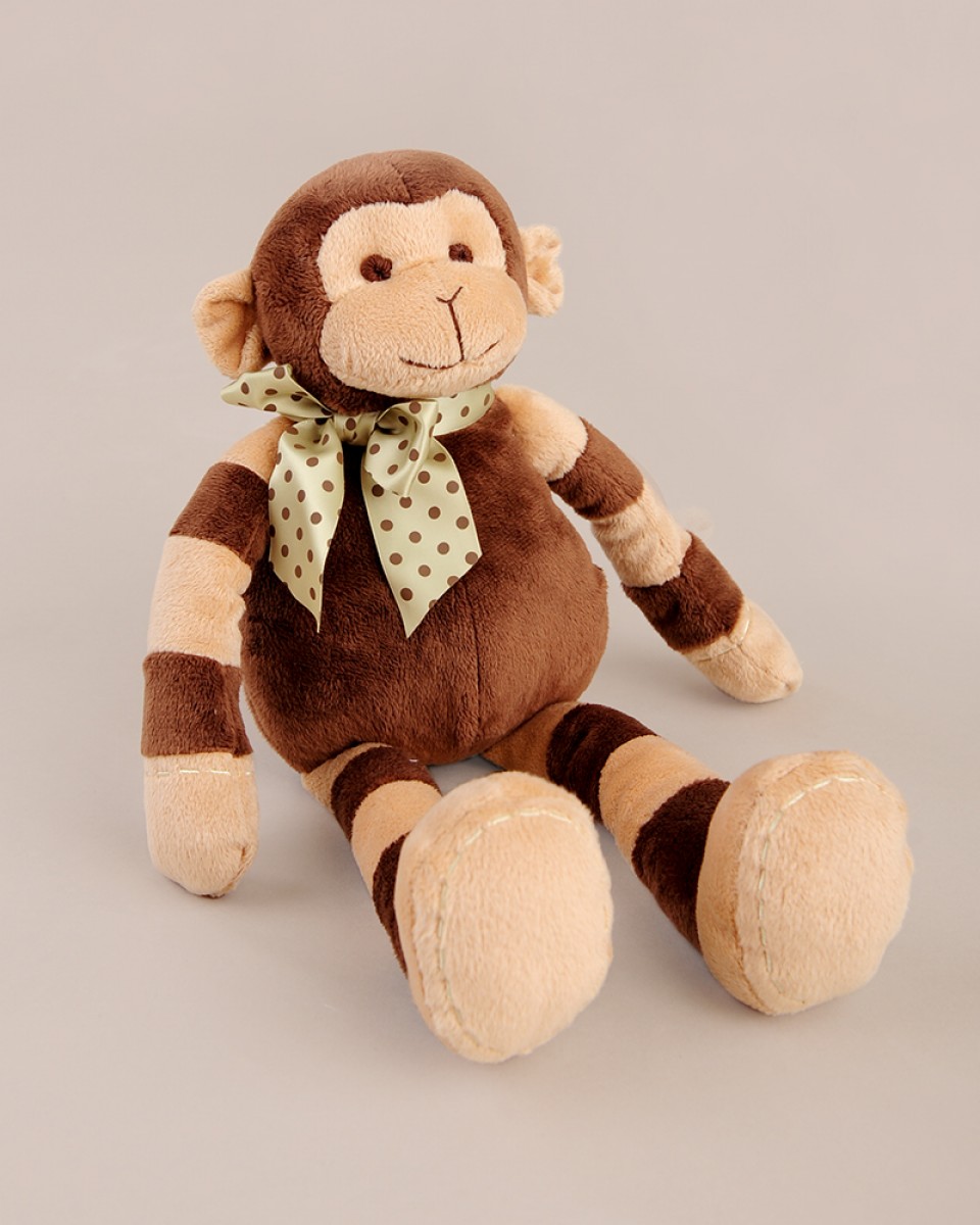 • Stuffed monkey is approximately 14 1/2″ long x 9″ wide