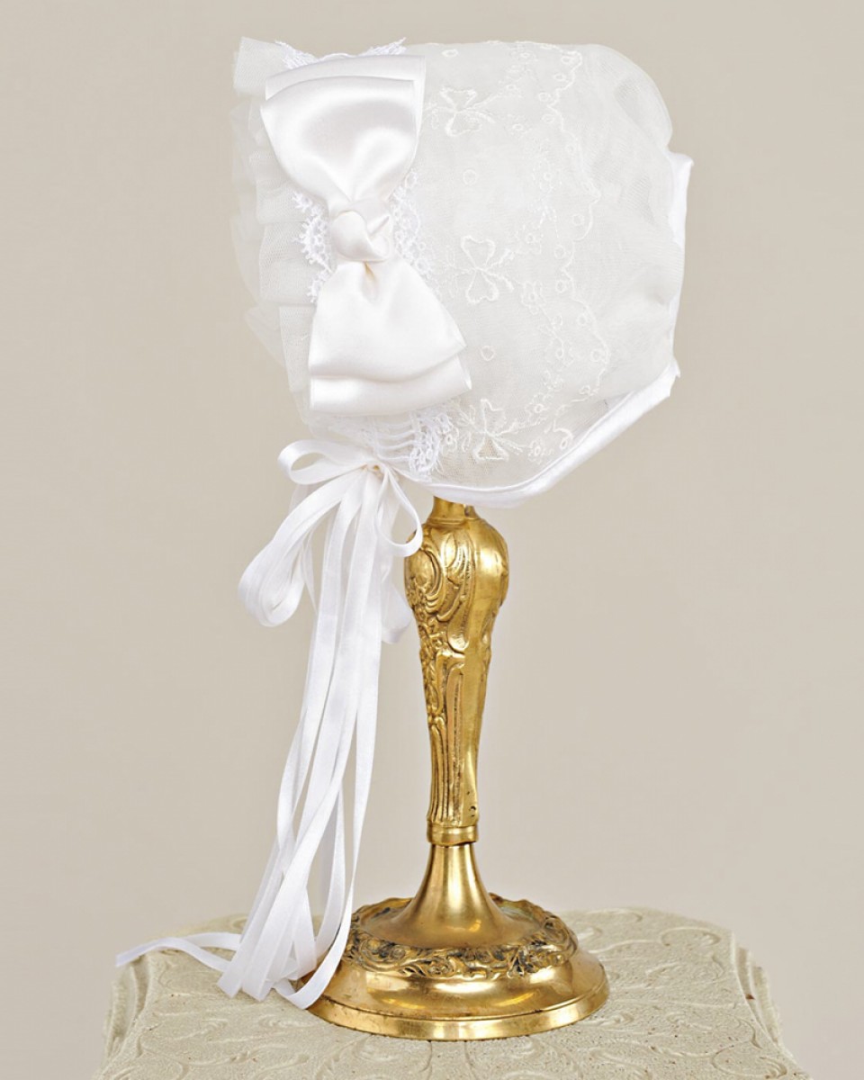 Gorgeous in every way, this pearl-white silk and lace christening bonnet is the perfect finishing touch for the lovely Natalia Christening Gown.