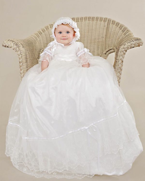 - 4-piece set includes delicate lace over-gown, silk under-gown, ruffled cotton slip, and bonnet (as pictured)
