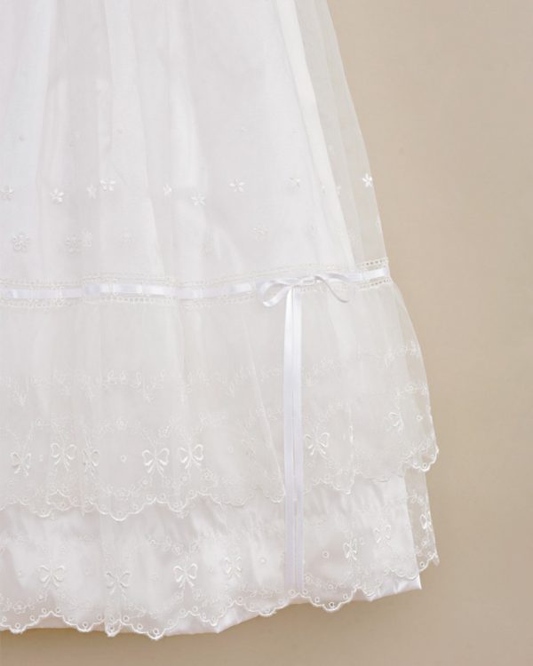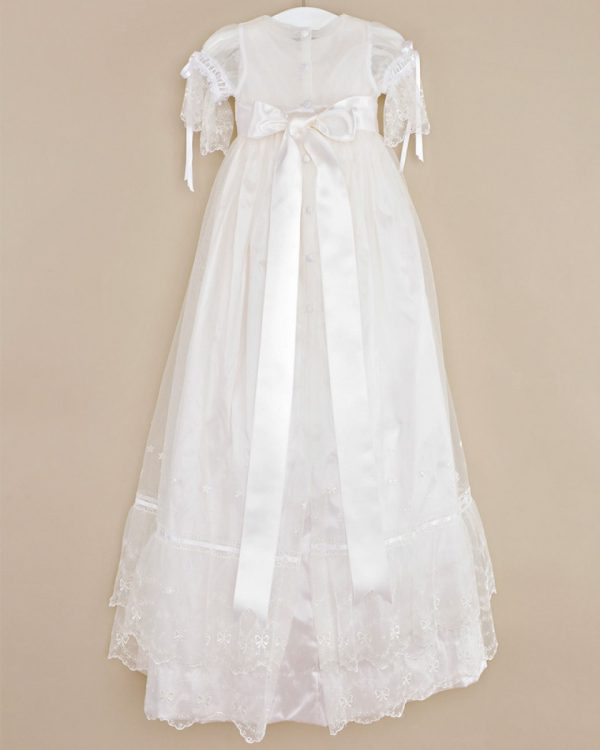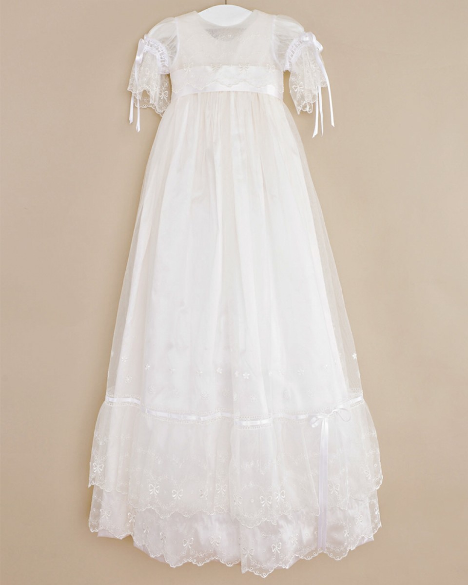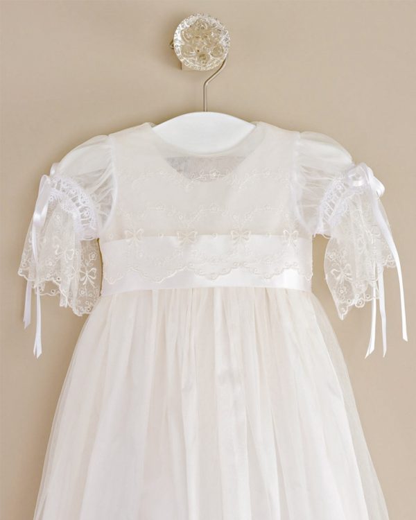 - Embroidered netting over-gown features puff sleeves, finished with gorgeous silk ribbon bows & delicate lace trim