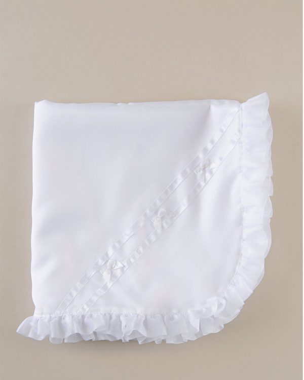 A sweet blanket trimmed with organza ruffles and lined with soft flannel in a small size for the tiniest of babies. This blanket coordinates with our Little Clarice and Little Angela preemie gowns.