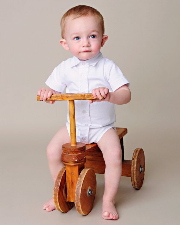 Layer this adorable cotton bodyshirt under his favorite baby pants for an effortlessly dressy look!