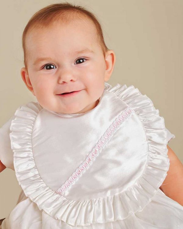 A classy silk Christening bib made from luxurious dupioni silk, trimmed with a simple pink braid trim–the perfect match for our Phoebe Gown.