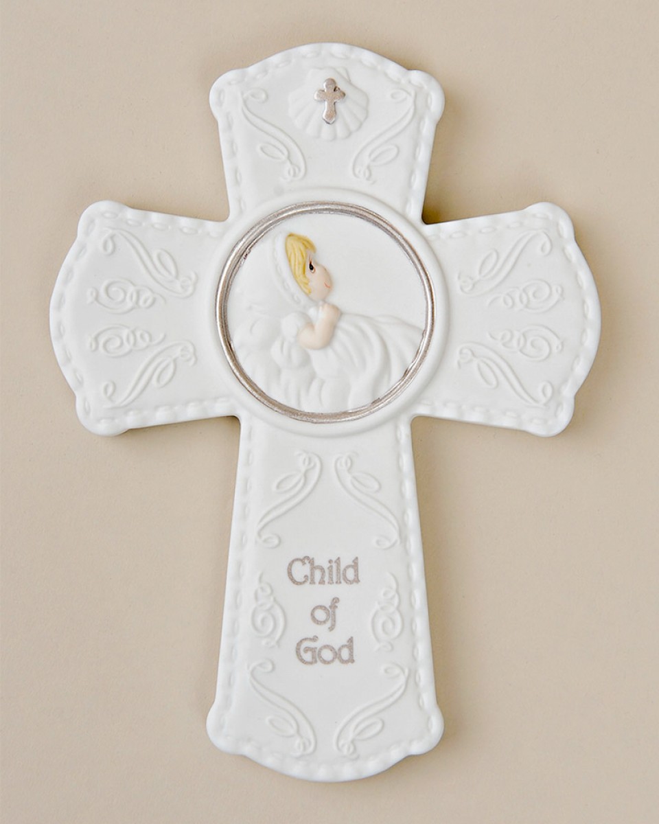 Pristine white porcelain Precious Moments wall cross: a beautiful addition to baby’s nursery decor.
